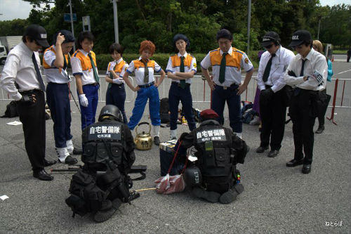 「機動警察パトレイバー」の特車二課に説教される自宅警備隊。この日は秋葉原のイベントにも警備に出る二面作戦のため、ワンフェスは2人だけだった