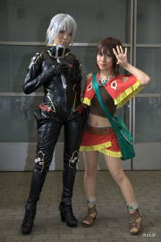 「翠星のガルガンティア」のレド少尉とエイミー(左)。ほかにもレド少尉をちらほら見かけた(中央)。ホールに展示されたチェインバー搭乗目当ての方が多かったもよう(右)