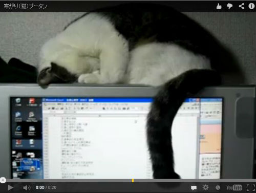 動画のタイトルは「寒がり(猫)ブータン」。寒いので温かいPCの上で眠っているようです。特に頭が寒かったのか、頭をモニターにぺたりとつけています。ちょっと無理のある姿勢に見えますが、意外と快適なのかもしれません。