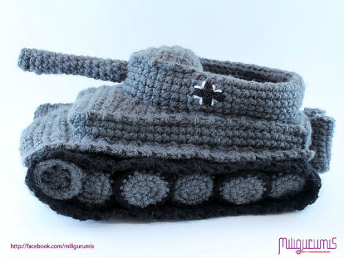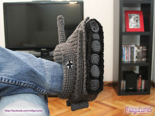 「Tiger 1 Tank – Panzer Crocheted Slippers」は戦車「Tiger1」そっくりに、黒やグレーの毛糸で手編みしたもの。手作りグッズサイトEtsyでオーダーメイドで販売(70ドル)しているほか、編み図のデータ(6.99ドル)も売っているので、腕に覚えのある人は自作もできます。今後Sherman戦車バージョンのスリッパも作る予定だそうです。