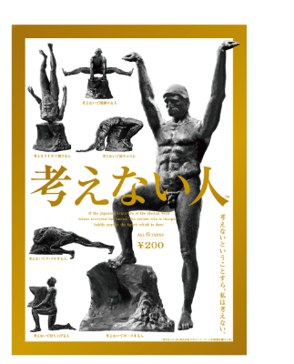 思索にふける「考える人」とは真逆に、寝たりタックルしたり、「ベスト・キッド」風のポーズをとったりと、何も考えていないことが丸わかりなフィギュアが6種。値段は1回200円となっています。