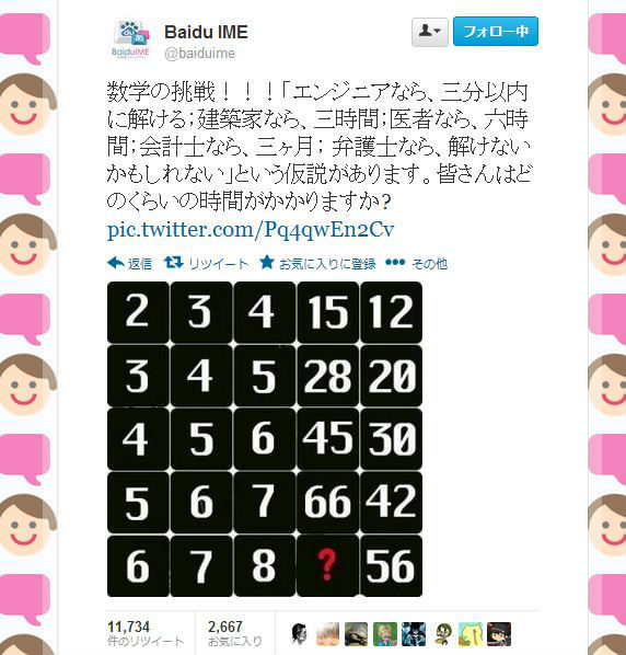 問題はBaidu IMEの公式アカウントがツイートしたもので、1万回以上リツイートされています。「エンジニアなら、三分以内に解ける;建築家なら、三時間;医者なら、六時間;会計士なら、三ヶ月; 弁護士なら、解けないかもしれない」という仮説があるそうです。編集部では「3分で解けた」「分からなかった」など結果はさまざま。皆さんは解けましたか?
