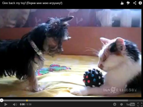 オモチャ返してワン……ネコから取り返せない弱気な子犬