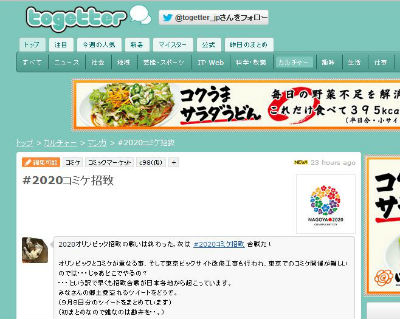 2020年五輪の招致プランでは、コミックマーケット(コミケ)会場として使われている東京ビッグサイトがメディアセンターや競技会場として使われる予定となっています。開催時期が重なることから、東京でのコミケ開催は難しいのでは……と、全国各地のユーザーが「#2020コミケ招致」のハッシュタグで招致合戦を繰り広げました。北は北海道から南は沖縄まで、各地のユーザーの声がTogetter「#2020コミケ招致」にまとめられています。