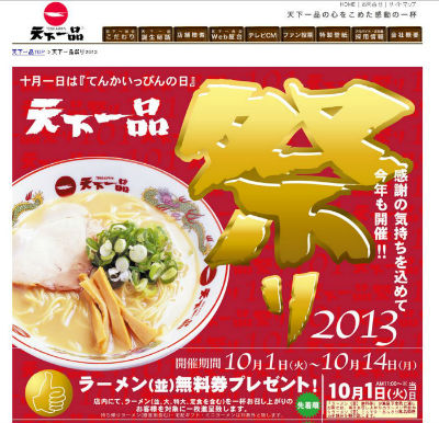 ラーメンチェーン「天下一品」で、今年も恒例の「天下一品祭り」が開催される。期間は10月1日(てんかいっぴんの日)から14日まで。
