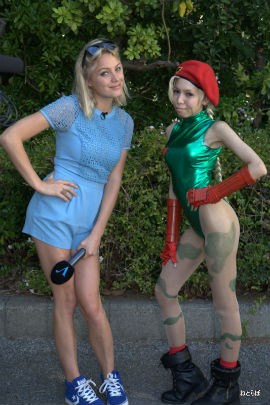 左:アメリカ人のエレン・イェーガー、アメリカでも「進撃の巨人」はファニメーション(FUNimation)で公式に配信されており大人気とのこと 右:海外メディアも多く取材に訪れており、「取材しているところを取材してくれ」と頼まれて撮影し、それをさらにビデオで撮影される、という自分でも「な……何を言っているのかわからねーと思うが」的なポルナレフ状態に