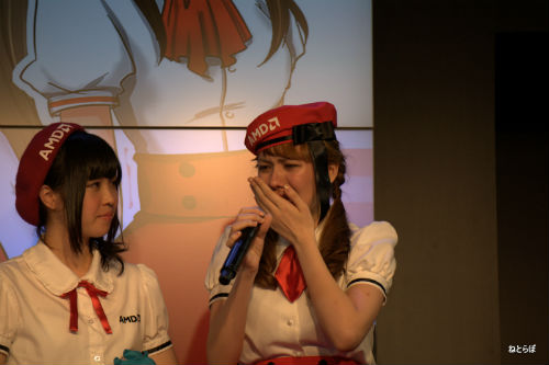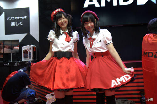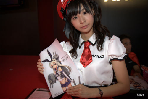 今回半導体メーカーのAMDもブースを出展。青二プロダクション所属の新人声優さんたちの「女の子のものづくりチーム」が常駐し、アンケートに答えると「艦これ」の島風ちゃんクリアファイルが配布されていた。ブースにAMD製品を持って行くとAMDのCPU(A10 6800K)がもらえるというサプライズもあり、沢山の観客で賑わっていた。最終日終了時の挨拶では温かい声援に感極まってしまう一幕も。