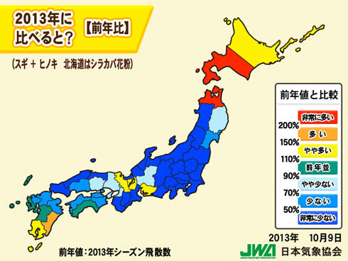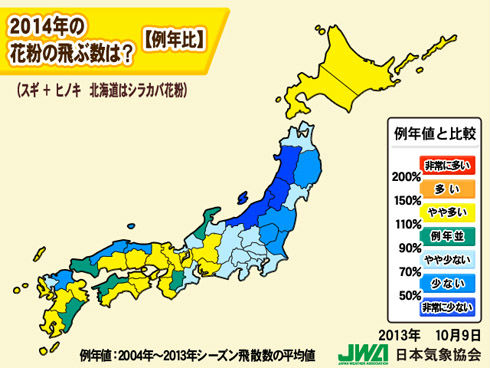 来春のスギ、ヒノキの花粉(北海道はシラカバ)の飛散量は、九州から東海地方のほとんどの地域と北海道は例年並みかやや多く、関東から東北地方は例年より少ない予測となっている。飛散が多かった2013年と比べると、九州から東北地方は少なくなる見込み。ただし北海道は前年の飛散量が少なかったので、それより多くなるという。