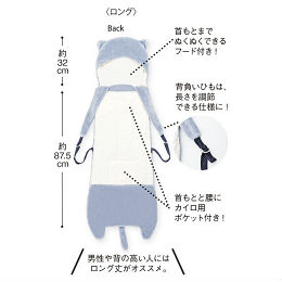 背中をすっぽり覆って温める“背負う毛布”のようなもので、ネコ耳つきフードで首もあったか。首元と腰にはカイロ用ポケットもついています。スモーキーブルーのロシアンブルーやしましまマンチカンなど6種類あり、月1回ローテーションで1個ずつ届きます。価格は1個3600円で、1回だけの注文も可能です。
