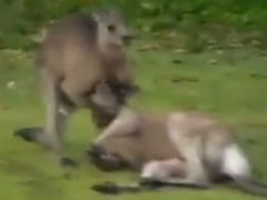 パンチとキックを繰り出して争っている2頭のカンガルー。激しい打撃の応酬でどちらも一歩も譲りません。と、もつれあって片方が地面に倒れたところでカンガルーさんの秘奥義スリーパーホールドが炸裂。首を完全にキメられた相手は全く抵抗ができないまま、驚くほどあっさりと締め落とされてしまいました。