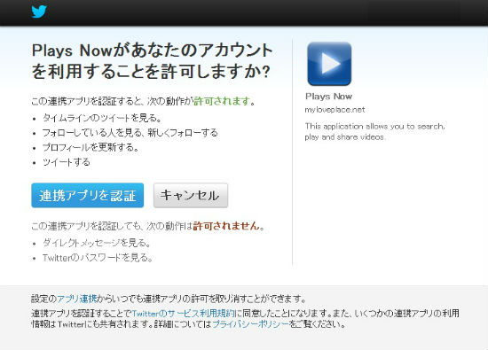 「Plays Now」を認証してしまうと、視聴した動画のタイトルなどが自動的にツイートされる。