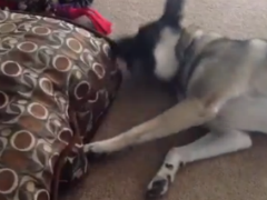 ネコに取られたベッドを取り返したいのにできない……そんな気弱な犬の動画です。