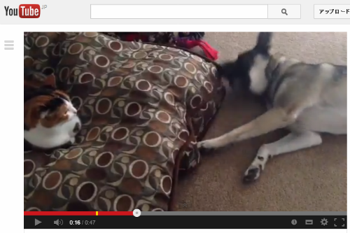 自分の寝床にどーんと居座るネコに、「お願いだから返して」と言っているかのようにうなる犬。実力行使には出られないようで、もだえるように床を転がりつつひだすらうなります。なんだか気の毒になりますが、全く動かないネコの泰然っぷりにも感心してしまいます。