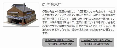 サイトでは9種類の台紙と組み立て説明書がダウンロードできます。赤福本店は明治10年(1877年)に建築された「切妻妻入り」の趣ある建物。ペーパークラフトでも妻入り屋根や煙突、「赤福」と書かれた看板などを組み立てられます。北側建屋や五十鈴茶屋も作って3軒連ねると、本店の風情あふれる様子を再現できます。