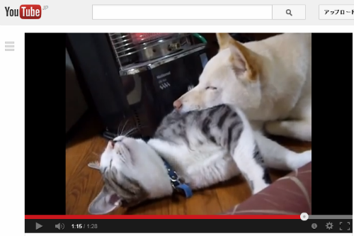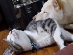 ストーブの前に寝転がるネコのおなかを見つめる犬。「いいかな?」と確認するようにカメラの方を見ると、ネコのおなかにぽふっと頭を載せます。枕にされたネコですが、そのまま犬を受け止め、2匹とも眠りの世界へ。仲むつまじい様子に和む動画でした。