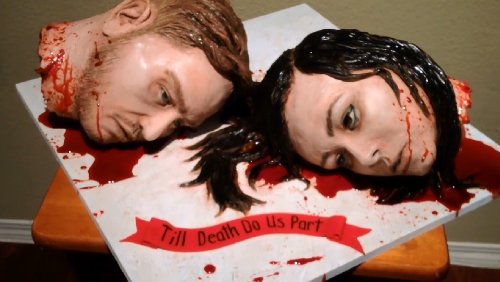 この恐ろしいケーキを作ったのはアメリカのケーキアーティストNatalie Sideserfさん。しかも自分の結婚式用。ハロウィーンシーズンで、結婚相手がホラー映画好きだからだそうですが、それにしても思い切ったデザインです。ケーキには「死が2人を分かつまで」という誓いの言葉が添えられていますが、生首ケーキと一緒だとなんだか違和感を感じてしまいますね。
