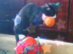 ボールをくわえながら玉乗りするネコの動画がYouTubeに投稿されています。2個のボールを扱う器用さと玉に乗った姿のかわいさに、なんだかおひねりあげたいぞ!