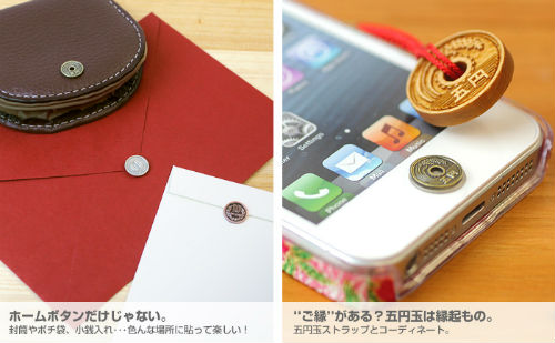 本物の硬貨をミニサイズにしたようなシールで、1円、5円、10円の3種類。ツヤのある質感と精巧に刻まれた図柄も再現した。iPhoneのホームボタンだけでなく、シールとしていろんなところにも貼れる。価格はそれぞれ480円。
