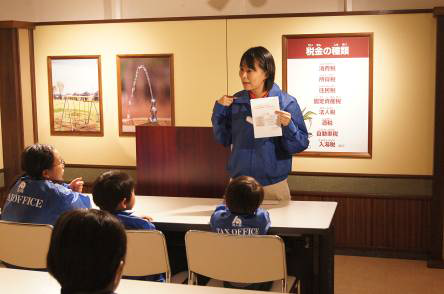 「税務署パビリオン」では、子供たちは「TAX OFFICE(税務署)」の衣装を着て、税務職員としての心構えや税金の必要性・使い道について学んだ後、キッザニアの店舗で税務調査を行うアクティビティを体験できる。所要時間は30分、定員は各回6人。