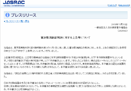 この問題は、JASRACの楽曲使用料の徴収方式が、他社の新規参入を排除しているかどうかにかかわるもの。公正取引委員会は2009年に、JASRACは独占禁止法に違反しないとする審決を下したが、高裁は11月1日にこれを覆した。JASRACは、高裁の判断は法令の解釈適用を誤ったもので、最高裁判所の判断を求める必要があるとしている。