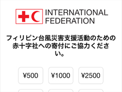 募金額は500円、1000円、2500円、5000円、1万円、2万円から選択可能。全額が赤十字社に送られるそうです。PCからの募金にも対応しています。