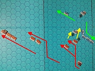 ルンガ沖海戦の戦況をボードウォーゲーム「アイアンボトムサウンド」で再現した。2120、距離6000で米海軍が突出していた「高波」を攻撃。高波は炎上しつつも敵を雷撃する(写真=左)。「親潮」「黒潮」は敵に見つかることなく接近して2128に雷撃。「長波」「江風」も反転しつつ2133に雷撃。高波の魚雷は敵巡洋艦2隻を撃破した(写真=中央)。「親潮」の魚雷は敵巡洋艦に命中。江風の魚雷は敵巡洋艦を撃沈する。そして、発射の射点を求めて敵に突撃した「陽炎」も2152に魚雷を放った(写真=右)