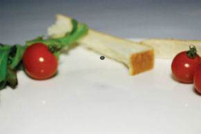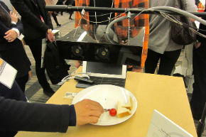 展示ブースでは、台の上にパンとミニトマトが乗ったお皿が置かれ、その上部に四角い箱が吊るされていた。黒い粒をピンセットでつまみ、お皿と箱の空間のある1点で放すと、お皿の上に落ちてしまうはずの粒が浮いたまま小刻みに震え出す。その様子はコバエそのものだ。