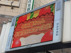 「今日、東名阪+南北の大型ビジョンで唯誕メッセージを流すよ! 見れる人は見てやってくださいな」――2chのスレ「けいおん!!紅茶4186杯目」にこんな投稿があったのは、27日の午前0時過ぎ。投稿に貼られた画像には、新宿のアルタビジョンや渋谷のアーチビジョンをはじめ、名古屋、大阪、札幌、神戸、博多、沖縄と、全国各地の大型ビジョンでメッセージを流すことが予告されていました。