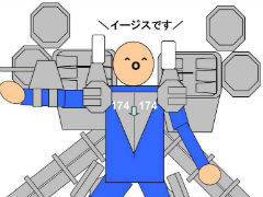 イラストは艦艇の装備をまとった図形人間。「イージスです」と言っているのでイージス艦のようです。人間が装備をまとった姿は「艦隊これくしょん」(艦これ)を意識しているのかもしれませんが、なんとも言えないシュールさが漂っています。10分ぐらいで作ったそうです。