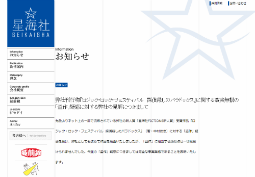 「星海社FICTIONS新人賞」受賞作品「ロジック・ロック・フェスティバル 探偵殺しのパラドックス」(中村あき)に対し、「天帝のはしたなき果実」(古野まほろ)に似ていると指摘する声がネットで上がっていた。