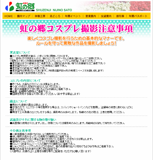 虹の郷のWebサイトにはコスプレ撮影の注意事項を記したページが設けられている