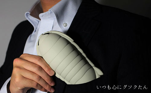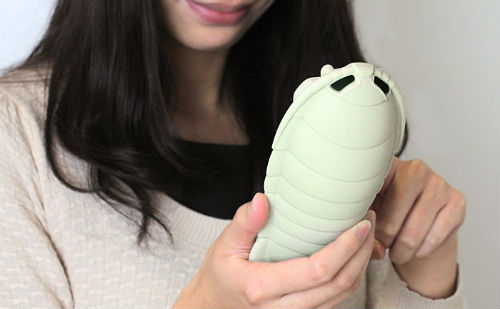 ダイオウグソクムシをデフォルメしたシリコンケースで、iPhoneをすっぽりと包みます。まるでiPhoneを丸のみしたよう。本物のダイオウグソクムシの背中の甲羅の重なり具合や丸みを再現しており、「触った際の滑らかさに少しゾワっとします」とのこと。