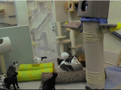 全身に麻のロープを巻きつけ手にはステップ台を持った男性。見た目としては色んな意味でしんどそうですが、体を張ってネコちゃんに尽くしています。たくさんのネコちゃんがいる部屋に立ち「さあ登って!」とアピールしますが、ネコちゃんたちは明らかに警戒している様子。恐る恐る近づいてきますが、そーっと伸ばした前足にも戸惑いが見られます。
