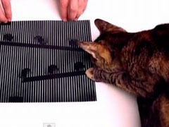 しま模様のクリアシートを重ねてずらすだけで、台紙の絵が動いて見えてしまう錯視アニメ「スリットアニメーション」。ネコの目でもスリットアニメにだまされることが分かる動画がYouTubeに投稿されています。