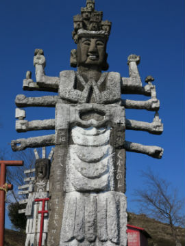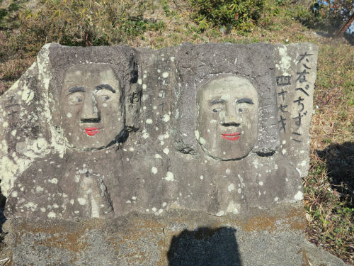 これらの仏像を作ったのは高鍋に住んでいた故・岩岡保吉さん。米屋を営んでいた岩岡さんは29歳で四国巡礼に出発したのを機に仏像に興味を持ったそう。当時の高鍋では持田古墳群の古墳の盗掘が相次ぎ、それに心を痛めた岩岡さんは、古墳の霊を鎮めるために仏像を作り始めたという。1977年に87歳で逝去するまで、岩岡さんは自由な発想で700体以上の石像を制作した。十二めんやくしや十一めんくわんのんの胴体には「岩岡山七十五戈のサク」と刻まれている。像の高さは7〜8メートルほど。こんな巨大像を75歳のときに作っただなんて、いやぁ、おみそれいたしました!