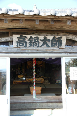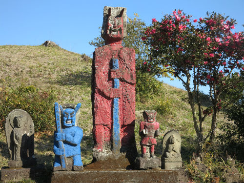 石段を上がった丘の上にある高鍋大師。巨大仏像の下の斜面には小さな仏像があちこちに置かれている