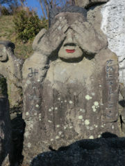 この像、何か目に違和感があると思ったら、目ん玉にプラスチックのお椀をひっくり返したようなものがはめ込まれているではないか。しかも、右目は上を向き、左目は正面を向いていて、完全に目がイってしまっている