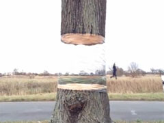 向こう側が透けて見えているのに何故木は倒れないんだろう……と思ってよく動画を見ると、人が木の裏側を通り過ぎる瞬間だけ見えなくなっています。よく見ると木に巻きつけたシートに背景をそっくり模写してあることが分かります。木は切られているわけでも浮いているわけでもなかったんですね。