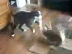スカートを引っ張って放さない犬に困っている様子の女の子。そこへネコが現れて犬を追い払い、ネコパンチを繰り出して撃退します。逃げる犬を追いかけるネコの勇ましさがステキですね。