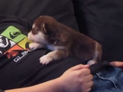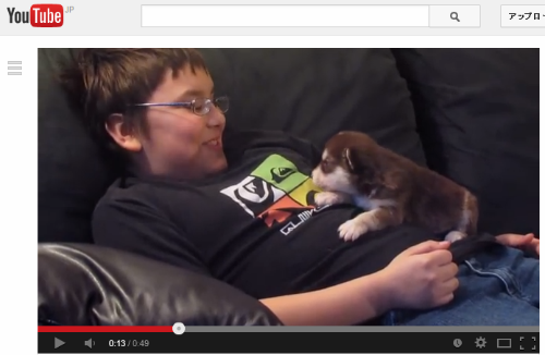 犬の鳴き声をまねる少年にならって、「あうーん」とほえる生後20日のハスキーの赤ちゃん。迫力ある遠ぼえはまだ無理のようで、とてもかわいらしいほえ方になっています。