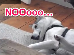 生後11カ月になるハスキー犬のBlazeちゃん。暖かい家の中でゴロゴロと幸せそうに寝そべっていたのですが、飼い主さんに「ほら犬小屋へ戻る時間だよ」と言われてしまい、露骨にイヤそうな表情に。飼い主さんが体を持ち上げようとすると、小声で「No……」と駄々をこねます。分かる、気持ちは分かるよ……!