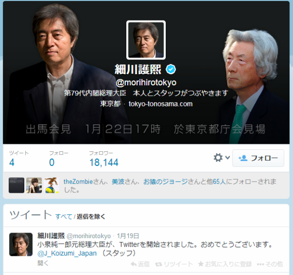 細川護熙元首相のTwitterアカウント。こちらも認証マーク付き。19日に「小泉純一郎元総理大臣が、Twitterを開始されました」と告知していた