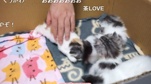 まだよちよち歩きの子ネコたちが箱の中でぎゅぎゅっと集まったりじゃれ合ったり。子ネコをなでる飼い主さんがうらやましくてたまりません。