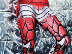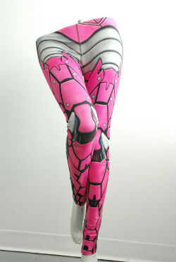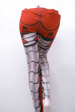 ポリエステル製のレギンスに、アーティストが描いたサイボーグの足のような模様がプリントされています。装甲プレートやボルト、プレートの継ぎ目などがリアルに描かれていて、メタリックな感じさえしてきます。