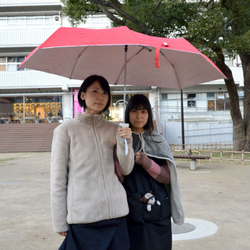 横が1163ミリとワイドサイズになっており、一般的な傘の約1.5倍の大きさ。大人2人で入ってもはみ出してぬれてしまう心配はないという。また縦に持てば、背中に大きなリュックを背負っていても傘でカバーできる。内側がシルバーコーティングされていて、日傘としても利用可能。