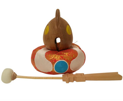 この「ウルトラ木魚」は、愛知県で仏壇店を営む都築数明さんが怪獣供養に感銘を受けて制作したもの。木魚をウルトラマンの顔の形に似せて彫刻を施し、目に色を付けた。木魚を据える座布団にもウルトラマンの胴体の模様やカラータイマーをデザイン。「ばい」と呼ばれる木魚を打つ棒はウルトラマンに登場した科学特捜隊の流星マークをモチーフにしている。