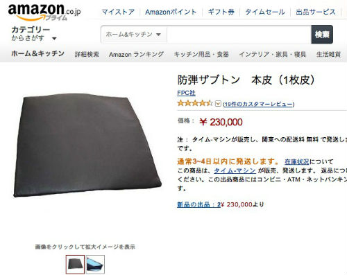 その商品は防弾素材を使った日用品「防弾ザブトン 本皮(1枚皮)」。お値段23万円とかなり高価な座布団ですが、人間2人までカバーできる優れた性能を持っているんだとか。
