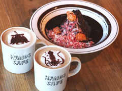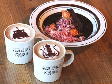 ハンズカフェでは期間限定で深海生物のラテアート(メンダコ・ダイオウイカ)が描かれた「深海ラテ」と、熱水噴出孔をモチーフにした「深海カレー」を販売する。
