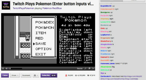 プレイ中のタイトルは任天堂の名作RPG「ポケットモンスター 赤」。視聴者がチャットで「up」「down」などの単語を書き込むことでゲームが進みます。すでにプレイ開始から5日目に突入し、総視聴者数は400万人を突破しています。