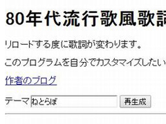 1980年代の流行歌のような歌詞を自動で作ってくれるシステム「80年代流行歌自動生成システム」が楽しいです。ユビキタスエンターテインメント社長・清水亮さんが開発したもので、自身のブログでも紹介しています